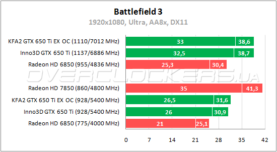 В шутере Battlefield 3 видеокарта Inno3D быстрее Radeon HD 6850 на 24%. Преимущество KFA² над товарищем лишь пару процентов. При разгоне GeForce приближаются к Radeon HD 7850, сокращая отставание до 6—7%.