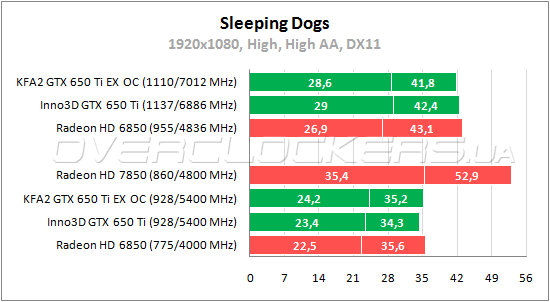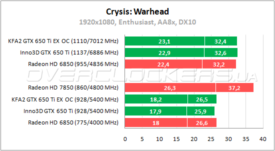 В Warhead старый Radeon HD 6850 на пару процентов лучше простого GeForce GTX 650 Ti по среднему fps. Разгон Inno3D повышает результаты на 26—28%, KFA² от повышения частот выигрывает 23—27%.