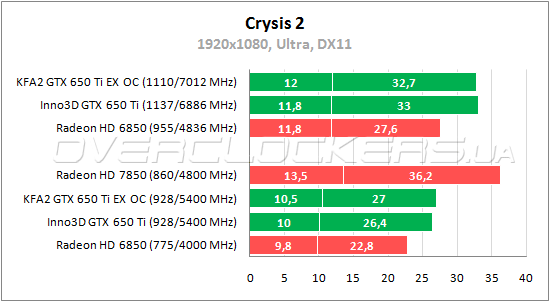 Заметный отрыв у GeForce GTX 650 Ti от старого Radeon в Crysis 2 — до 16% по среднему fps. При разгоне у Inno3D мизерное преимущество над форсированным KFA².