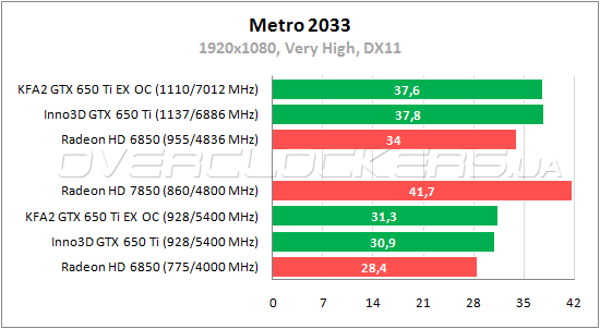 GeForce GTX 650 Ti снова обходит старичка AMD в игре Metro 2033. В номинале KFA² демонстрирует маленький отрыв от Inno3D, а при разгоне видеоадаптеры меняются местами.