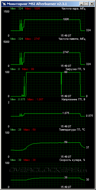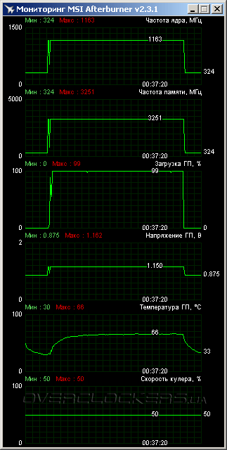 Повысив напряжение до максимума, мы добились стабильности на частотах 1163/6502 МГц. Некоторое время видеокарта даже отработала в таком разгоне при стандартной скорости обдувающего вентилятора. Но в итоге все равно пришлось «разгонять» и вентилятор. Подняв его обороты до 50%, мы избавились от сбоев и легко прошли все тесты. Температура ядра при этом не превышала 66 °C, но шум был уже очень высокий.