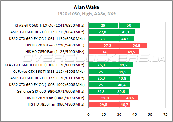 Начнем с Alan Wake. В этой игре всегда доминировали решения AMD. В номинале ASUS немного обгоняет Radeon HD 7850 по средней частоте кадров, но уступает по минимальному fps. При разгоне конкурент только увеличивает отрыв от GeForce GTX 660.