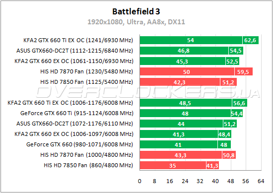 В Battlefield 3 видеоадаптер ASUS демонстрирует преимущество в 7% над обычным GeForce GTX 660, обгоняя даже Radeon HD 7870 с минимальным отрывом на уровне одного процента. Отставание от старшего GeForce GTX 660 Ti составляет 6—9% и почти полностью компенсируется разгоном.