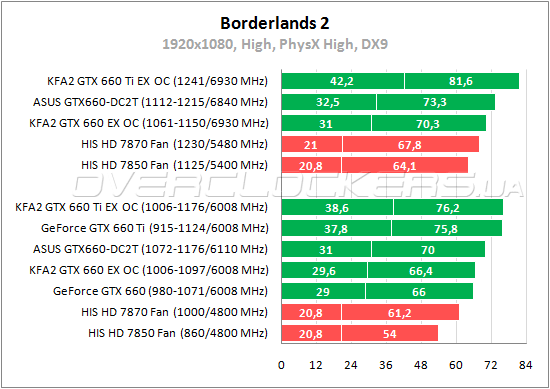 Благодаря высокой частоте ядра ASUS в Borderlands 2 изначально демонстрирует производительность на уровне предельно разогнанного видеоадаптера KFA² GTX 660 EX OC. Впрочем, от своего разгона ASUS выигрывает немного и демонстрирует скромное преимущество в 4—5% над товарищем. С включенными физическими эффектами PhysX видеокарты AMD в данной игре вполне ожидаемо оказываются слабее представителей NVIDIA.
