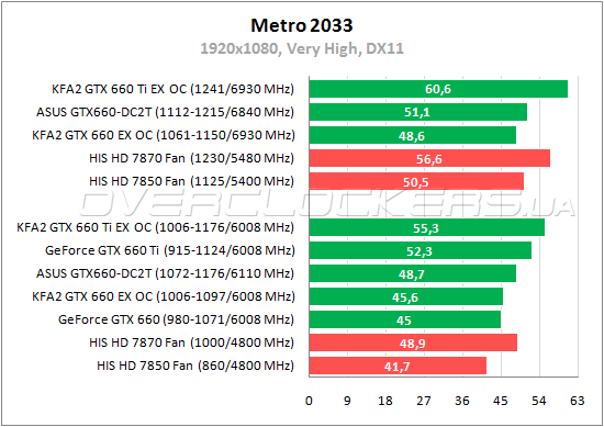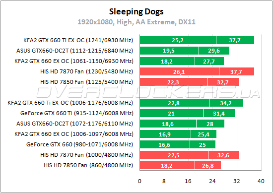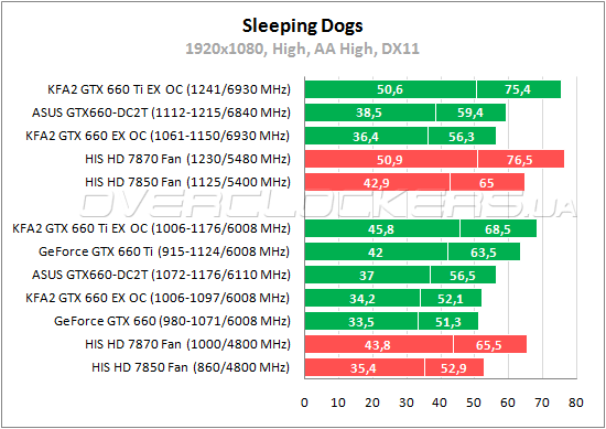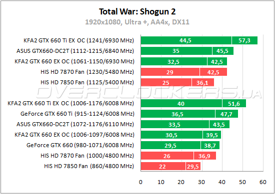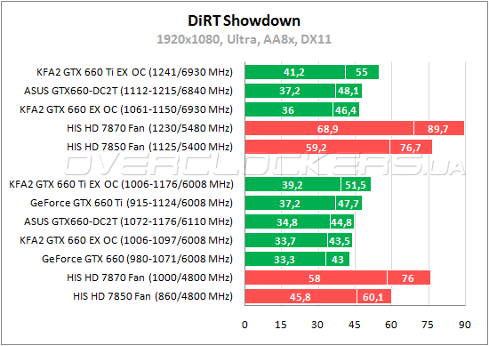 Обычный GeForce GTX 660 немного слабее Radeon HD 7850 в этой игре, но заводской разгон ASUS уже обеспечивает преимущество над конкурентом. При разгоне младший Radeon оттесняет оба ускоренных GeForce GTX 660. Отставание от GeForce GTX 660 Ti составляет 12—13% и компенсировать его разгоном не удается.