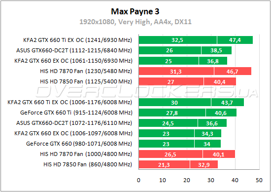 В игре Max Payne 3 мы видим стандартную разницу в 7—8% между ASUS GTX660-DC2T-2GD5 и простым GeForce GTX 660. Radeon HD 7850 уступает герою нашего обзора 11—15%, а Radeon HD 7870 производительнее на 8—10%. Разгон дает небольшой прирост в 5—6%, и этого мало, чтобы обойти ускоренный Radeon HD 7850.