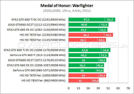 Производительность ASUS на заводских частотах в Medal of Honor: Warfighter соответствует уровню Radeon HD 7870. Отставание от GeForce GTX 660 Ti не более 5%, так что при разгоне до 1112—1215/6840 МГц удается не только нагнать, но и немного обогнать старшего брата.