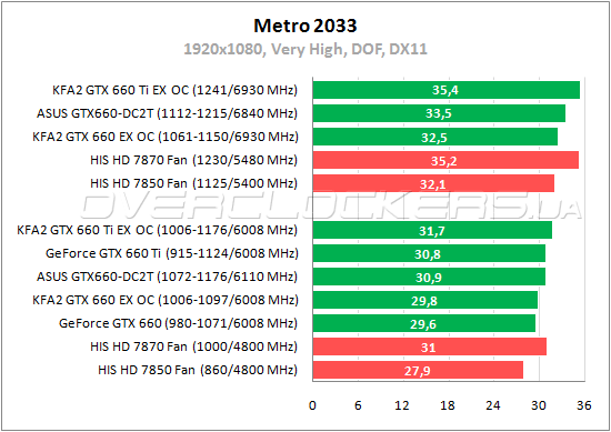 В обоих тестовых режимах Metro 2033 адаптер ASUS почти не уступает Radeon HD 7870 в номинале и сохраняет небольшое преимущество над Radeon HD 7850 при разгоне. Бросается в глаза идентичные с GeForce GTX 660 Ti результаты при активном эффекте улучшенной глубины резкости. Но в таком режиме игра очень чувствительна к пропускной способности памяти, что и сдерживает потенциал старшего GeForce.