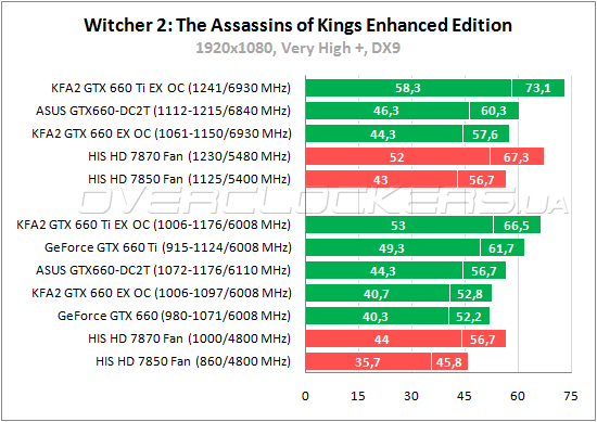 Во втором «Ведьмаке» в номинале у ASUS GTX 660 и Radeon HD 7870 идентичные результаты. При повышении частот второй уходит в отрыв. Компенсировать отставание от GeForce GTX 660 Ti разгоном ASUS снова не удается.
