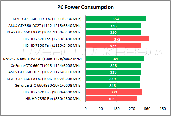 Энергопотребление ASUS GTX660-DC2T-2GD5 повыше, чем у простого GeForce GTX 660, но поменьше чем у GeForce GTX 660 Ti и Radeon HD 7870. При разгоне «аппетиты» систем с ASUS и KFA² идентичны.