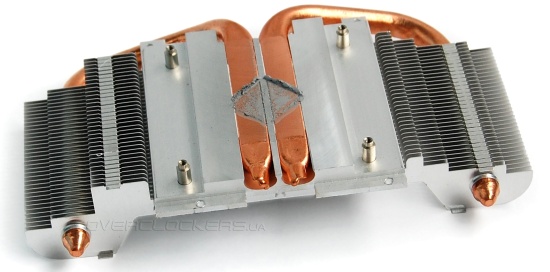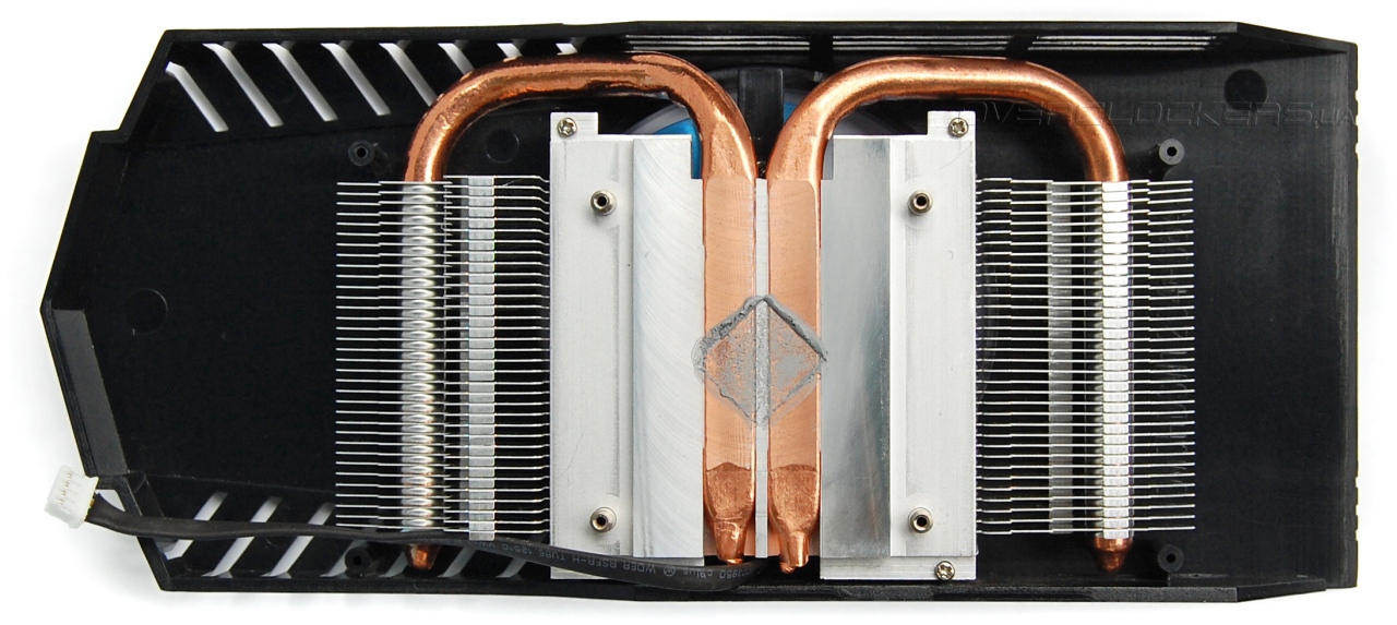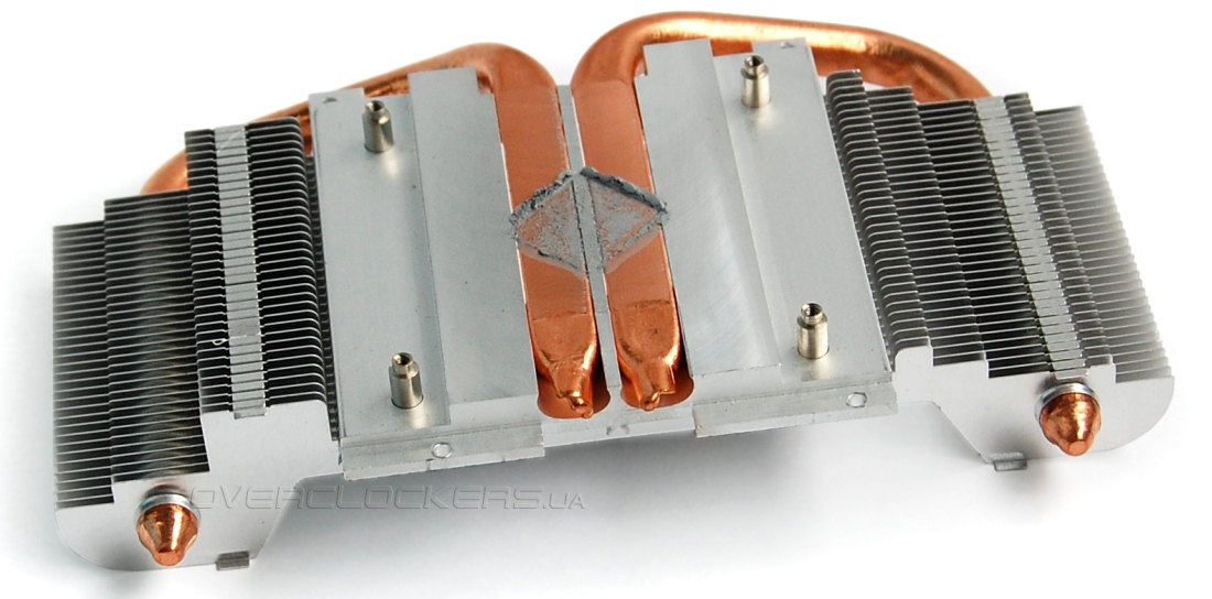 Радиатор под кожухом небольшой. Есть две толстые тепловые трубки, которые напрямую контактируют с поверхностью кристалла.
