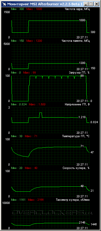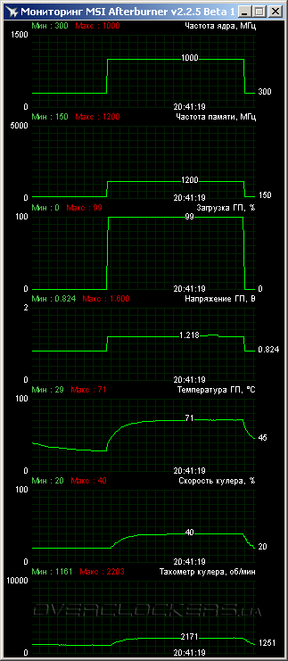 В MSI Kombustor температура не превысила отметку в 71 °C, но вентилятор немного ускорился до 2200 об/мин.