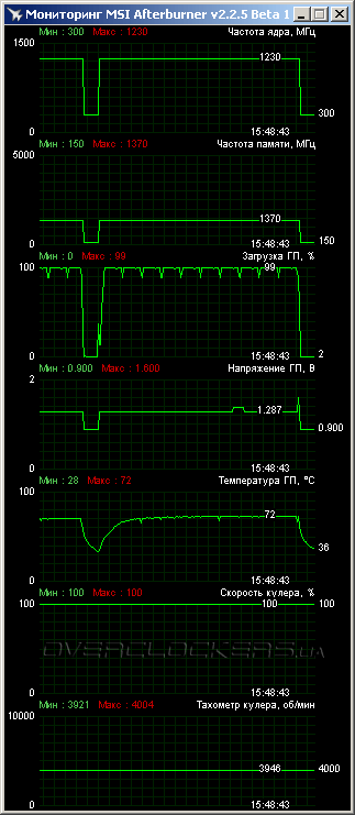 По верхним графикам видно, что напряжение GPU при нагрузке скачет вплоть до страшного значения в 1,6 В. Аналогичный «баг» с мониторингом мы наблюдали и на других Radeon HD 7870. Согласно положению соответствующего ползунка в MSI Afterburner реальное напряжение равно 1,218 В.
