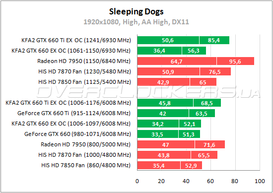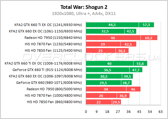 Несмотря на заметный прирост производительности в этой игре с Catalyst 12.11 позиции GeForce все равно очень сильные. GeForce GTX 660 в номинале производительнее Radeon HD 7870, а Ti-версия обгоняет даже Radeon HD 7950. У KFA² GTX 660 Ti EX OC преимущество над референсным собратом в 8—10%. Между младшими GeForce на базе GPU GK106 разница 2—3%.