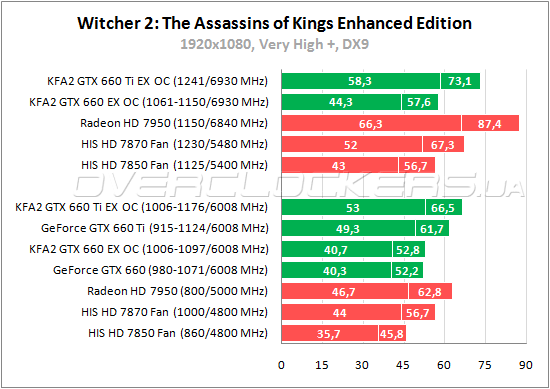 Во втором «Ведьмаке» простой GeForce GTX 660 Ti не только обходит Radeon HD 7870, но и демонстрирует более высокий минимальный fps в сравнении с Radeon HD 7950. GeForce GTX 660 производительнее Radeon HD 7850 на 13—14% и 9% уступает Radeon HD 7870. Лидером в номинале является KFA² GTX 660 Ti EX OC, который на 8% быстрее референсного собрата.