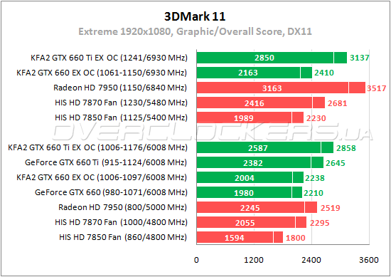 Новый драйвер помогает Radeon HD 7870 обойти GeForce GTX 660 в 3DMark 11, а Radeon HD 7950 сводит к минимум отставание от GeForce GTX 660 Ti. Radeon HD 7850 на 24% слабее младшего GeForce. KFA² GTX 660 Ti EX OC выигрывает у обычного товарища Ti-серии почти 9%. Между младшими представителями NVIDIA разница 1,2%.