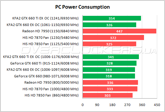 Разница между всеми участниками в номинале небольшая. Наиболее экономичный Radeon HD 7850. Аппетиты системы с GeForce GTX 660 Ti чуть меньше показателей энергопотребления компьютера с Radeon HD 7870, но KFA² GTX 660 Ti EX OC уже обходит Radeon HD 7950. При разгоне у младших конкурентов от AMD и NVIDIA схожие показатели. Ускоренный KFA² GTX 660 Ti EX OC оказывается экономичнее форсированного HIS HD 7870 Fan.