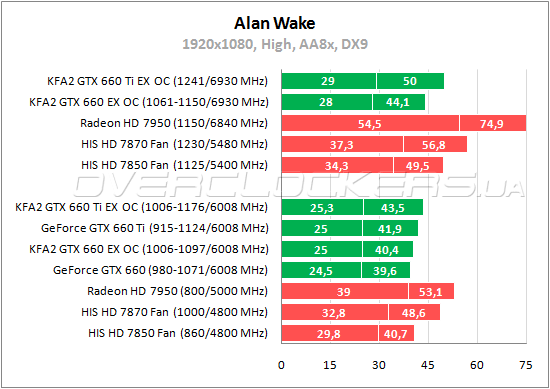 В обоих тестовых режимах Radeon HD 7870 удерживает преимущество над GeForce GTX 660 Ti, а Radeon HD 7850 обходит GeForce GTX 660. Однако разница между этими конкурентами небольшая, особенно в более простом режиме, и при разгоне старший GeForce сводит свое отставание от HIS HD 7870 до минимума. Еще стоит отметить, что в номинале KFA² GTX 660 Ti EX OC чуть быстрее Radeon HD 7870.