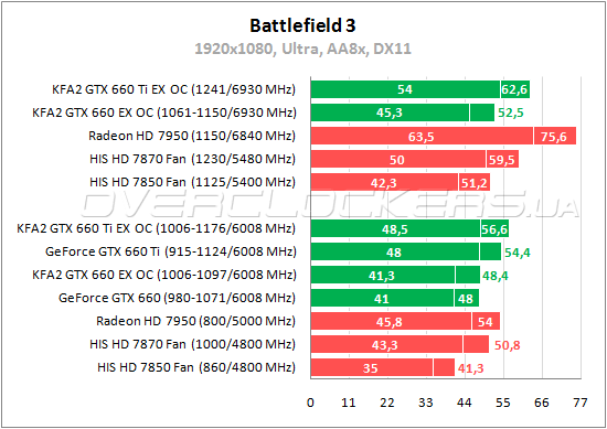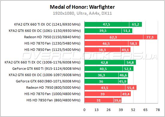 В Medal of Honor: Warfighter GeForce GTX 660 не дотягивает 8% до результатов Radeon HD 7870 и на 16% обоняет Radeon HD 7850. У GeForce GTX 660 Ti преимущество над младшим братом не более 13,5%. Radeon HD 7950 является лидером, KFA² GTX 660 Ti EX OC уступает ему менее 2%. При разгоне Radeon HD 7950 уходит в значительный отрыв от остальных участников. Оба GeForce сохраняют свое преимущество над своими основными конкурентами AMD и при повышении частот.