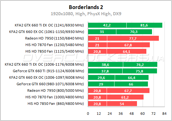 В Borderlands 2 благодаря аппаратному ускорению PhysX лидируют видеокарты NVIDIA. И если по средней частоте кадров Radeon HD 7950 чуть лучше простого GeForce GTX 660, но по минимальному fps значительное преимущество все равно у GeForce. Обращает на себя внимание и большая разница между двумя товарищами NVIDIA — 30% по минимальному fps и 15% по среднему показателю. Поэтому нагнать Ti-версию простому GeForce GTX 660 при разгоне не удается.
