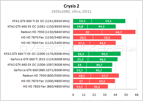 В Crysis 2 простой GeForce GTX 660 демонстрирует близкий к Radeon HD 7870 средний fps, но по минимальному показателю находится на одном уровне с Radeon HD 7850. GeForce GTX 660 Ti на 6% лучше Radeon HD 7870 по средней частоте кадров, но хуже на 11% по минимальному fps. KFA² GTX 660 Ti EX OC на 4% лучше Radeon HD 7950 по среднему показателю, но заметно уступает по минимальному. При разгоне GeForce сохраняют преимущество над конкурентами по среднему fps, но по минимальному по-прежнему хуже их.