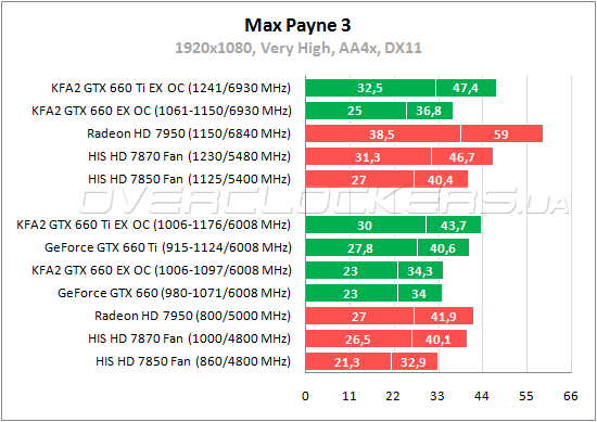 В игре Max Payne 3 у GeForce GTX 660 небольшое преимущество над Radeon HD 7850 в 3—8%, а GeForce GTX 660 Ti быстрее Radeon HD 7870 лишь на 1—5%. KFA² GTX 660 Ti EX на заводских частотах обходит Radeon HD 7950 на 4—11%. При разгоне Radeon HD 7850 вырывает победу у младшего GeForce, а вот старший GeForce GTX 660 Ti преимущество над Radeon HD 7870 сохраняет.