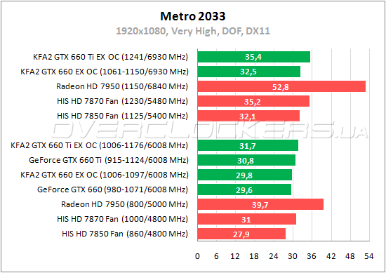 При включении Depth of Field ситуация немного меняется и Radeon HD 7870 удается обойти GeForce GTX 660 Ti, хотя результаты обоих в номинале далеки от комфортного уровня. При разгоне столь же малое преимущество уже у KFA² GTX 660 Ti EX OC. У Radeon HD 7950 наблюдается значительный отрыв от остальных участников даже в номинале.