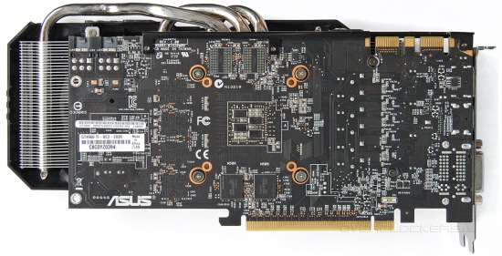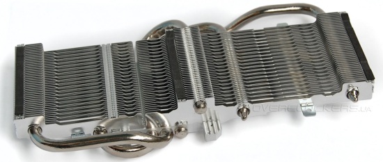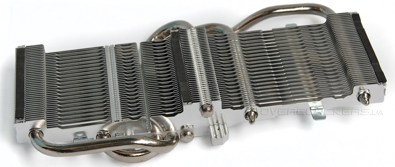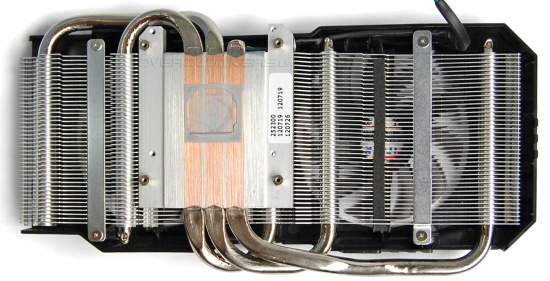 Система охлаждения по своим габаритам превосходит размеры платы, что хорошо видно по верхним фотографиям. Конструкция этой системы ничем не отличается от охлаждения уже упоминавшихся GTX670-DC2T-2GD5 и GTX670-DC2-2GD5. Три массивные тепловые трубки напрямую отводят тепло от графического процессора. Они очень плотно подогнаны по форме к желобкам в алюминиевом основании.