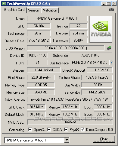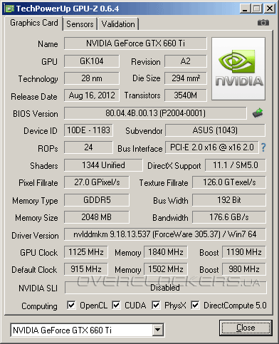 Power Limit у данного видеоадаптера можно поднять на 18%, примерно как и у старших GeForce. Референсные GeForce GTX 660, например, в этом плане похуже — они позволяют увеличить границу своего ограничителя мощности лишь на 10%. Повышение лимита до максимума является необходимостью при разгоне — это позволяет добиться больших частот в режиме Boost.