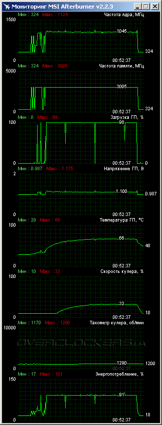 Реальная частота GPU в 12-минутном тесте Crysis: Warhead держалась в диапазоне 1033—1058 МГц. Максимально возможная частота 1124 МГц, но такие скачки наблюдались лишь при переключении режимов, не во время реальной нагрузки.