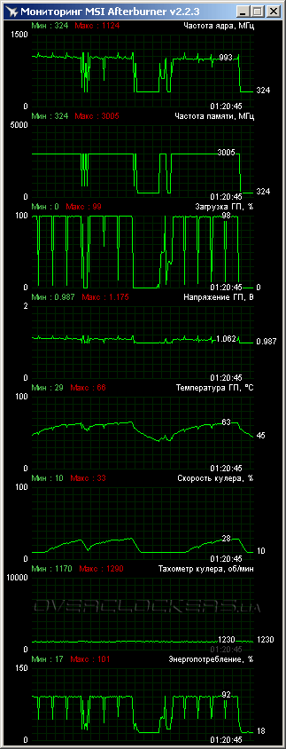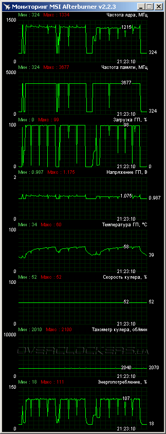 Обороты и температура держались в указанных пределах во всех тестах. А вот частота в некоторых приложениях падала и до более низких значений. В Hard Reset карта работала в диапазоне 993—1006 МГц. В Crysis 2 наблюдались редкие просадки до 980 МГц.
