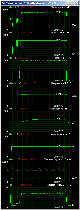 В реальности частота в Crysis держалась на уровне 1256—1293 МГц. Память смогла стабильно функционировать на 7354 МГц.