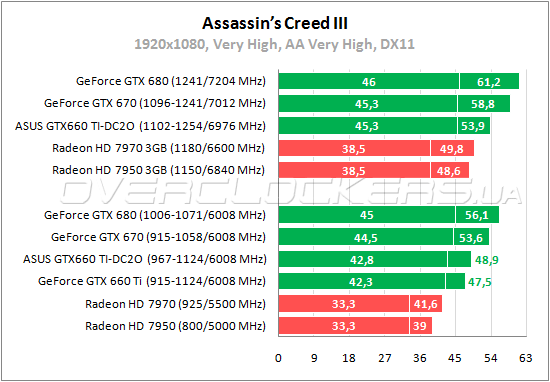 Несмотря на принадлежность к программе AMD Gaming Evolved в этой игре у видеокарт NVIDIA Kepler всегда отличные результаты. Radeon HD 7970 проигрывает даже простому GeForce GTX 660 Ti, не говоря уже о DC2O-версии от ASUS.