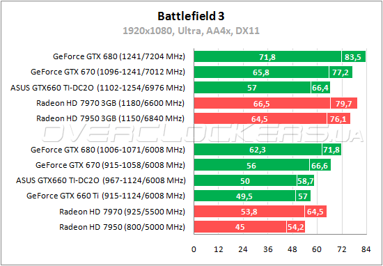 Мизерный отрыв ASUS от простого GTX 660 Ti в Battlefield 3. Radeon HD 7950 на 5–10% слабее младшего GeForce и на 8–11% хуже ASUS. Разгон дает прирост в 13–14%. Форсированный Radeon HD 7950 наверстывает упущенное и обходит ASUS.