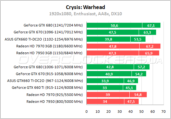 В Warhead рассматриваемый ASUS уступает Radeon HD 7950 около 1% по среднему fps. Простой GeForce GTX 660 Ti слабее младшего конкурента AMD на 3–5%. Разгон ускоряет ASUS на 14–17%.