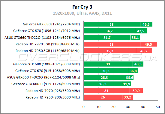 В последнем Far Cry младший GeForce GTX 660 Ti не уступает Radeon HD 7950 по минимальному fps, проигрывая 4% по среднему. ASUS GTX660 TI-DC2O-2GD5 оказывается на 6–8% производительнее референса и даже немного быстрее младшего Radeon. Разгон дает прирост в 13%.