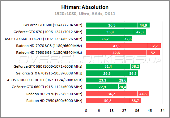 А вот в новом Hitman при активном сглаживании GeForce GTX 660 Ti выглядит слабо на фоне Radeon HD 7950, уступая в среднем 35%.