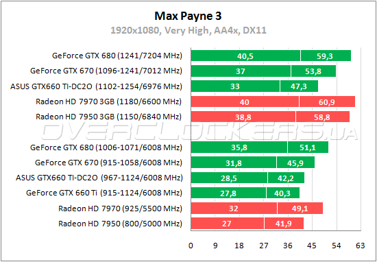 В Max Payne 3 между GeForce GTX 660 Ti и Radeon HD 7950 по минимальному fps небольшое преимущество у первого, а средняя частота кадров выше у второго. ASUS по обоим параметрам обходит с крошечным отрывом конкурента AMD.
