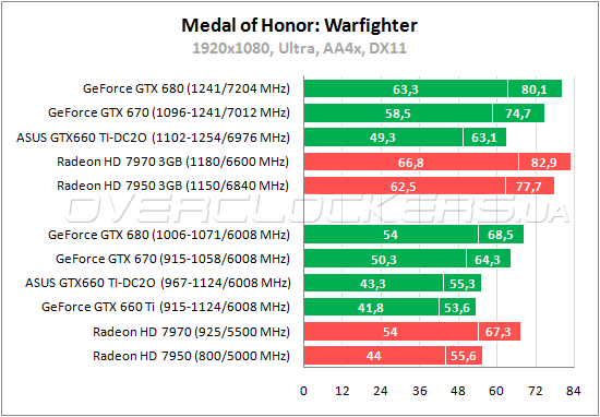 Скромное преимущество ASUS над младшим собратом в Medal of Honor на уровне 3%. Radeon HD 7950 в этот раз удается обойти ASUS, менее чем на 2%.