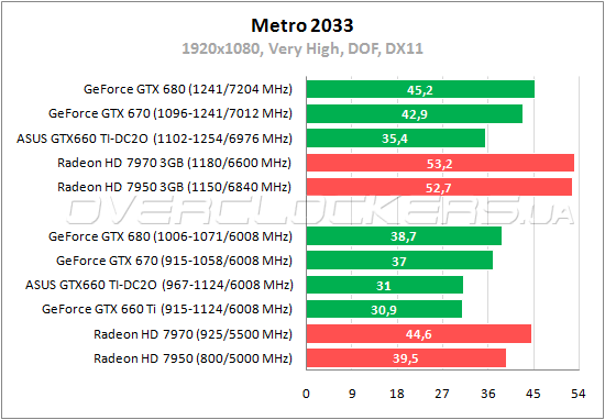 В Metro 2033 с активным Depth of Field 192-битный GeForce GTX 660 Ti значительно проигрывает старшим картам. Разница между двумя версиями младшего GeForce стремится к нулю, что в данном случае объясняется одинаковой частотой памяти (а игра к этому чувствительна). Разгон ускоряет героя обзора на 14%.