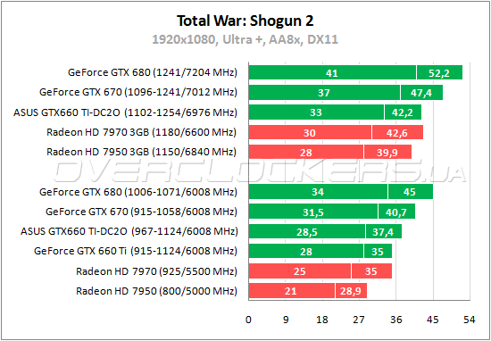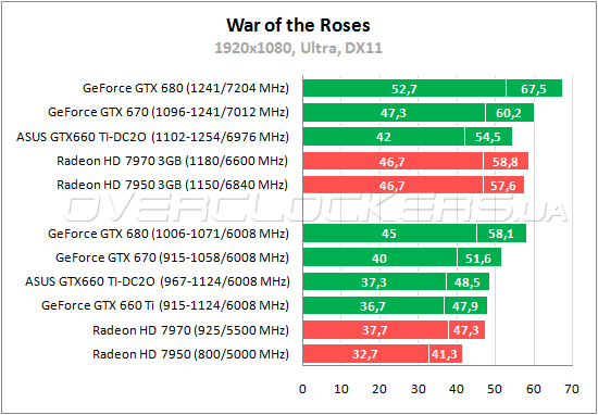 В сетевом экшене War of the Roses можно говорить о примерном паритете между GeForce GTX 660 Ti и Radeon HD 7970. ASUS, естественно, чуть быстрее. Обойти этого конкурента младшему Radeon удается при разгоне.