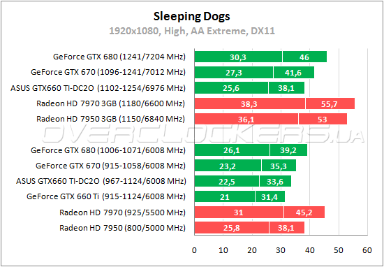 В Sleeping Dogs младший GeForce GTX 660 Ti проигрывает 21–23% видеоадаптеру Radeon HD 7950, отставание ASUS 13–15%. С разгоном GTX660 TI-DC2O-2GD5 как раз выходит на уровень производительности младшего Radeon.