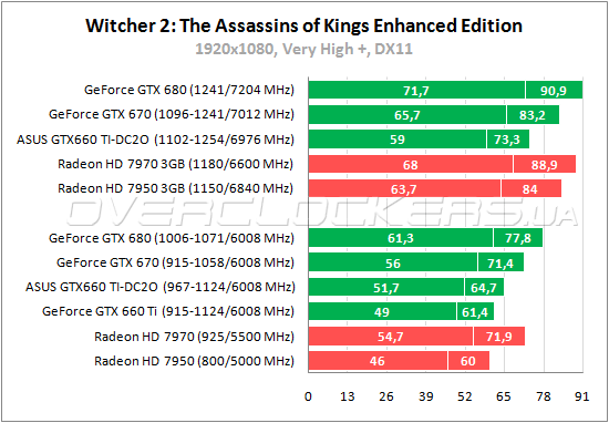 GeForce GTX 660 Ti выигрывает 2–6% у Radeon HD 7950 во втором «Ведьмаке». У ASUS преимущество в 5,5% над собратом. Прирост от разгона типичный — 14%.