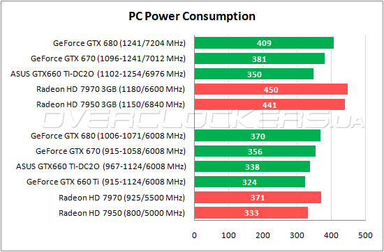 Простой GeForce GTX 660 Ti (GTX660 TI-DC2-2GD5) экономичнее Radeon HD 7950. Система со старшим ASUS GTX660 TI-DC2O-2GD5 потребляет чуть больше компьютера с Radeon HD 7950, хотя разница мизерная. Ну и при разгоне вполне ожидаемо самым экономичным оказался именно ASUS.