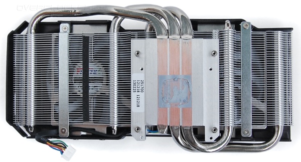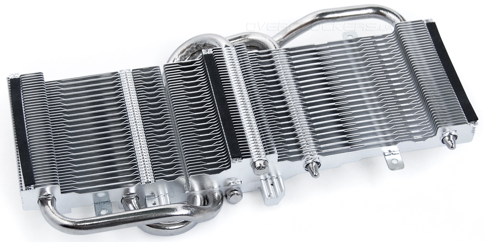 В основе конструкции три толстые тепловые трубки, которые напрямую контактируют с поверхностью кристалла GPU. Изгибаясь, трубки пронизывают массив плотно подогнанных друг к другу пластин радиатора. Форма пластин неоднородна, половина имеет трапециевидные вырезы в верхней части.