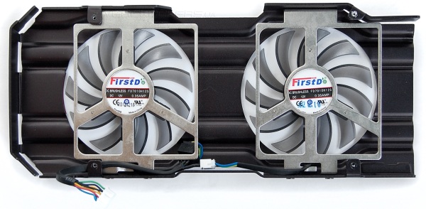 На радиатор устанавливается кожух с парой вентиляторов FirstD FD7010H12S диаметром 80 мм.