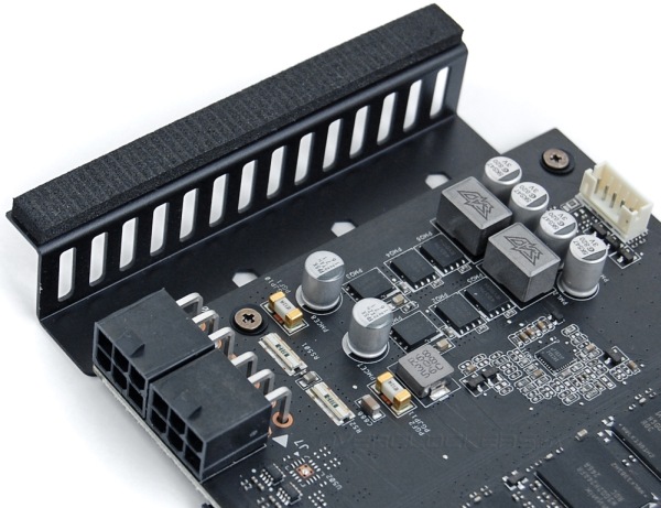 Шестифазный преобразователь напряжения GPU управляется контроллером Digi+ ASP1212. Узел питания памяти насчитывает две фазы. Используются высококачественные компоненты с большим запасом прочности, отвечающие внутреннему стандарту компании Super Alloy Power.