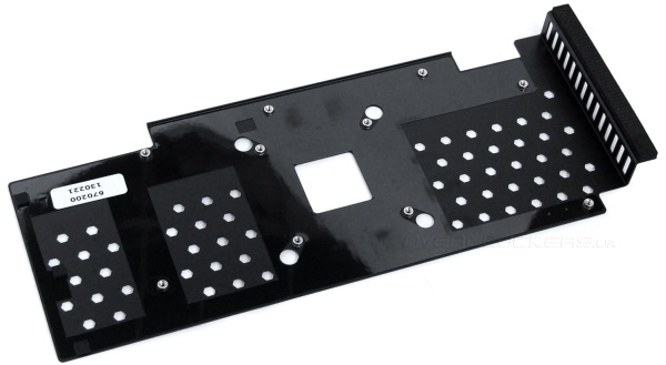 А вот пластина, накрывающая обратную сторону платы, ни от каких элементов тепло не отводит. Она придает жесткость карте во избежание прогиба текстолита.