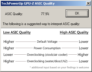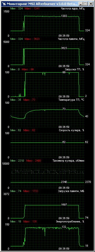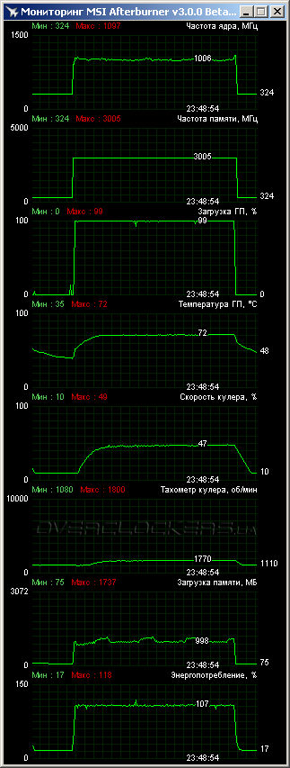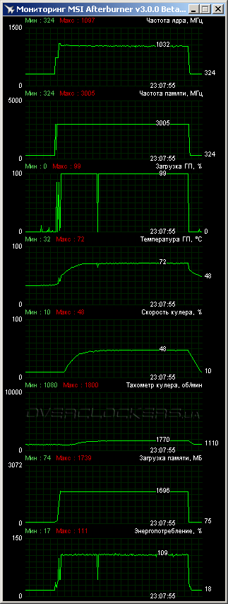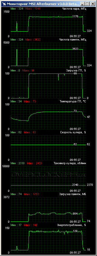 При нагрузке в течении 12-минут бенчмарком Crysis: Warhead карта не прогрелась свыше 72 °C при 26–27 °C в помещении. Реальная частота ядра варьировалась в пределах 1019–1045 МГц. В самом начале был скачок до 1097 МГц. Скорость вентиляторов не превысила 1800 об/мин.