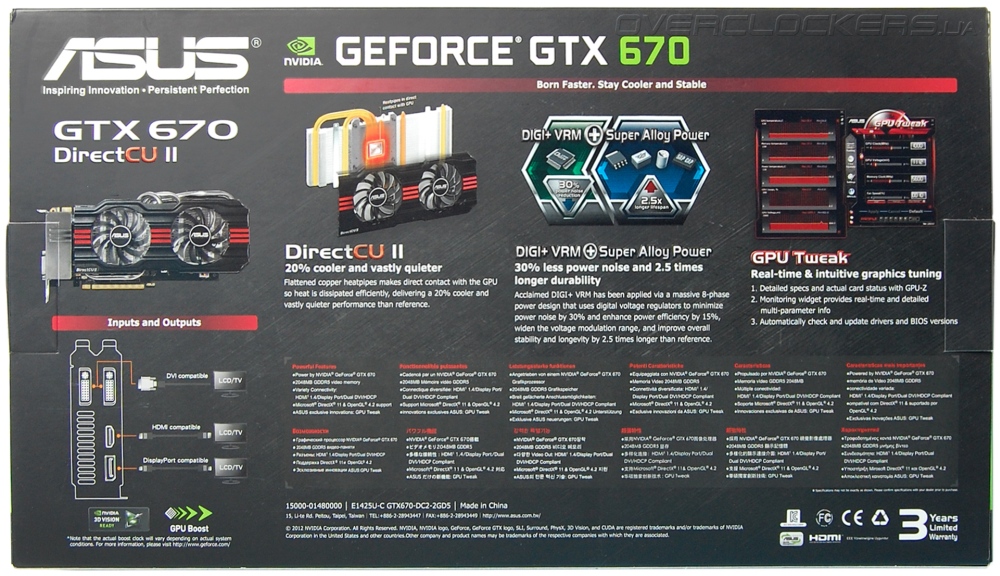 GeForce GTX 670 от ASUS порадовал отличным техническим исполнением и хорошим охлаждением — доработанная плата с усиленной системой питания, двухвентиляторный кулер с приличным по площади радиатором и толстыми тепловыми трубками. Температура графического процессора и шум ниже показателей референсных моделей. Плюс хороший разгонный потенциал, который позволил увеличить производительность нашего экземпляра до 18%. И такой значительный разгон оказался возможным даже при умеренных оборотах и терпимом уровне шума. Это позволяет ASUS GTX670-DC2-2GD5 конкурировать с Radeon HD 7970 во многих приложениях не только в номинале, но и при разгоне. Компенсировать небольшое отставание от GeFoce GTX 680 при повышении частот тоже не составит труда. Так что это один из лучших представителей семейства GeForce GTX 670 и отличный кандидат на покупку.